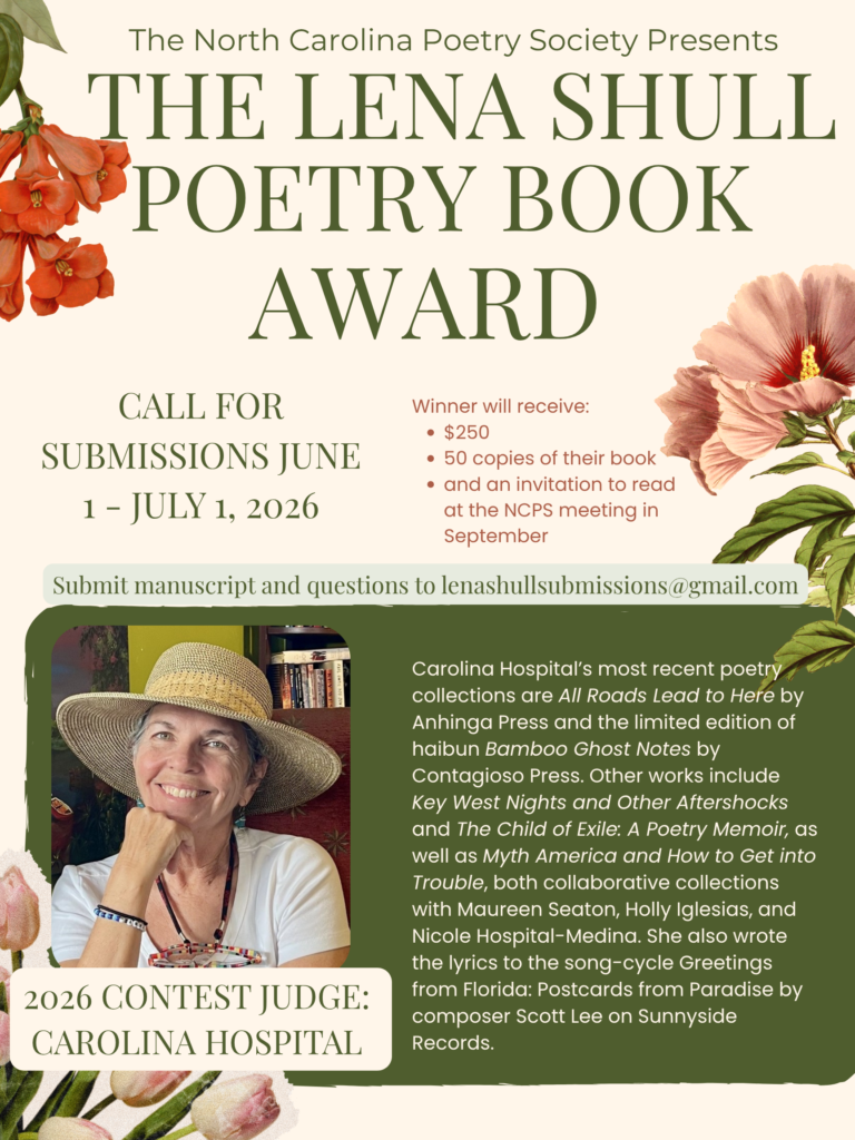 Sponsored annually by the North Carolina Poetry Society, the Lena Shull Book Award honors the best manuscript of unpublished poetry written by a native or resident of North Carolina. The winning manuscript will be published by Redhawk Publications. The winner will receive $250, fifty copies of their book, and be invited to read at the NCPS meeting in September. The entry fee is $25 per manuscript. Submissions accepted June 1-July 1, 2026. The 2026 Lena Shull Poetry Book Contest judge will be Carolina Hospital.