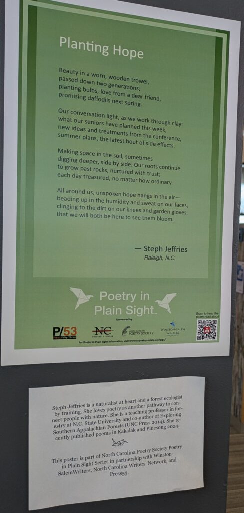 Steph Jeffries is a naturalist at heart and a forest ecologist by training. She loves poetry as another pathway to connect people with nature. She is a teaching professor in forestry at N.C. State University and co-author of Exploring Southern Appalachian Forests (UNC Press 2014). She recently published poems in Kakalak and Pinesong. She can be found on Instagram and Youtube.